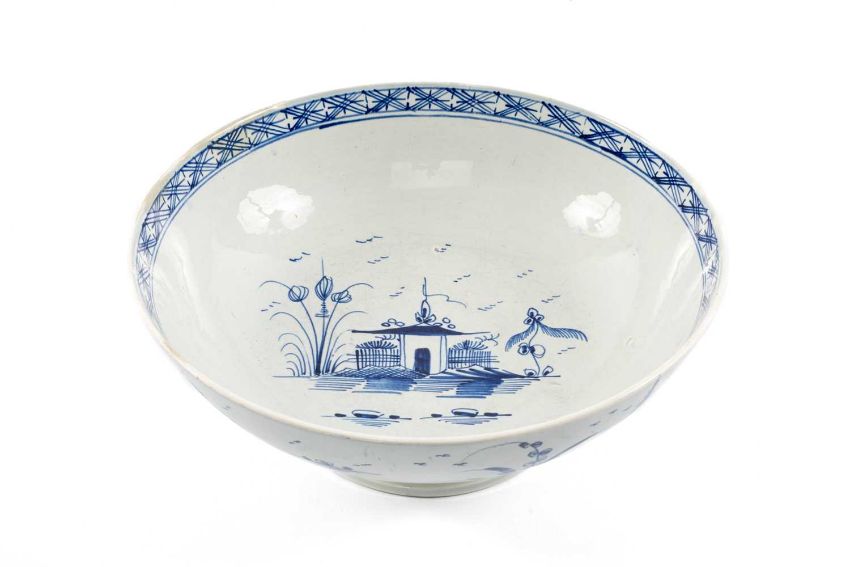 LARGE LIVERPOOL PEARLWARE BLUE & WHITE PUNCH BOWL, late 18th century, exterior painted with a chinoiserie design of houses, fences, and trees, inner lattice border with building and trees to centre, 11 (h) x 28.5cms (diam.)Provenance: private collection Merseyside