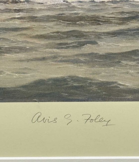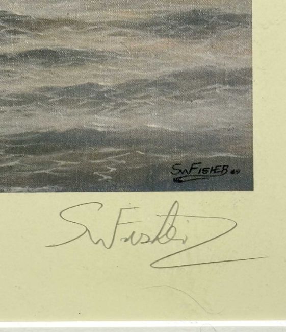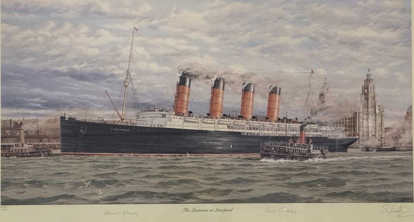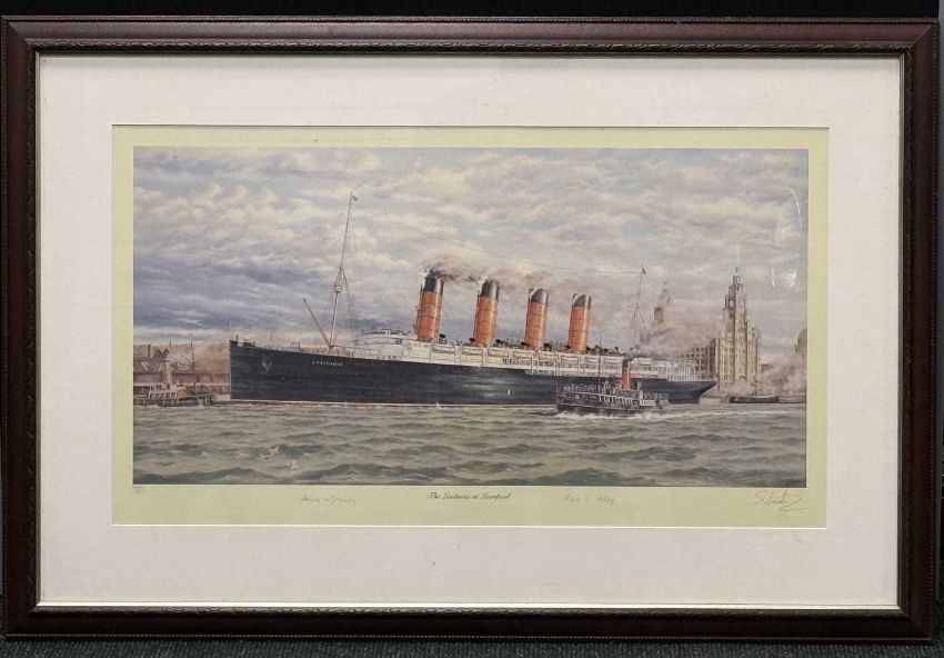 SIMON W. FISHER (British, late 20th century) limited edition (688/850) colour print - 'The Lusitania at Liverpool', signed by the artist and survivors Alice Drury and Avis Foley, 40.5 x 72.5cmsProvenance: private collection CheshireComments: framed and glazed
