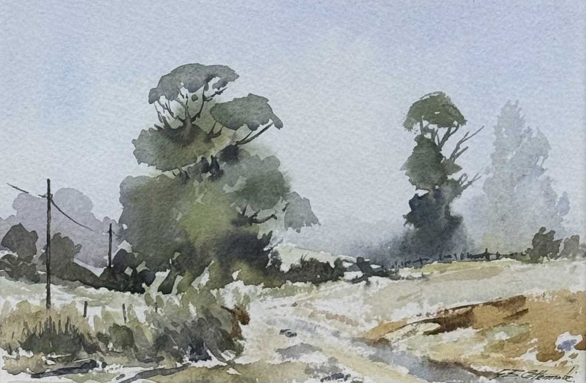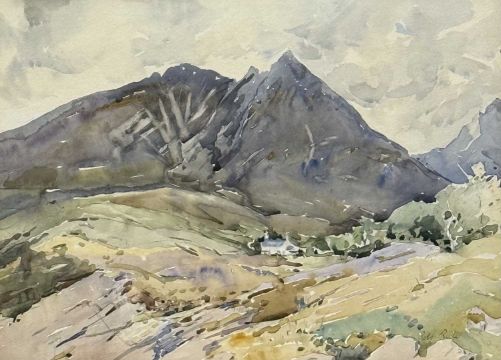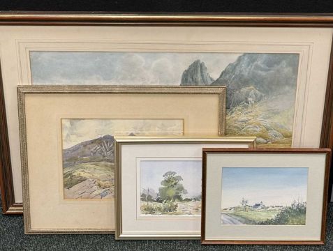 FREDERICK CLIVE NEWCOME (1847-1894) watercolour - Cumberland landscape, signed, 42 x 72cms; ROBERT RULE (19th century) watercolour - 'On the Isle of Arran', signed, 25 x 34cms; GRAHAM CATTERMOLE (contemporary) watercolour - Cheshire fields, signed, 17 x 24cms; and P. BRUN contemporary watercolour - continental townscape, 18 x 24cms (4)Provenance: private collection Cheshire