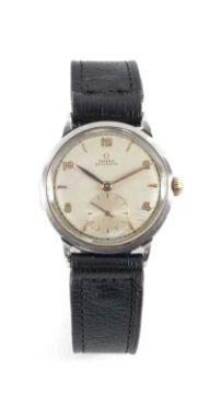 VINTAGE OMEGA AUTOMATIC STAINLESS STEEL-CASED WRISTWATCH, silvered dial with subsidiary seconds dial, on associated leather strap, 32cms (diam.)Provenance: private collection Cheshire