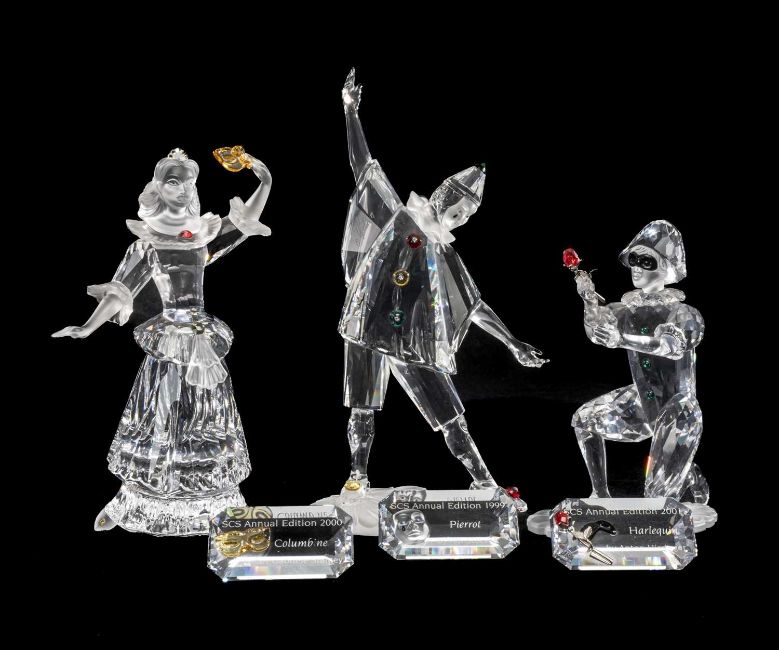 SWAROVSKI CRYSTAL SOCIETY 'MASQUERADE' FIGURES, Harlequin, Pierrot and Columbine, with nameplates, all boxed Provenance: private collection Merseyside