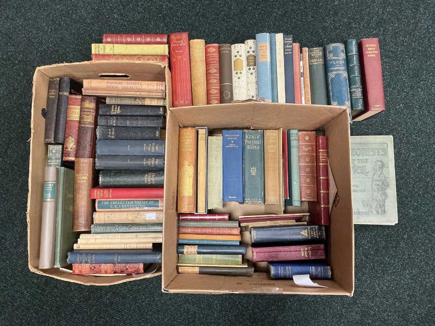 POETRY: ASSORTED COLLECTABLE BOOKS, including 'Longfellow's Poetical Works' and 'Elizabeth Browning's Poetical Works', pub. Nimmo, Hay & Mitchell, decorative vellum spines; Milton (John) 'Minor Poems', limited edition (36/250), pub. The Country Press, Bradford 1926, vellum bound, etc. (2 boxes)Provenance: private collection Cheshire