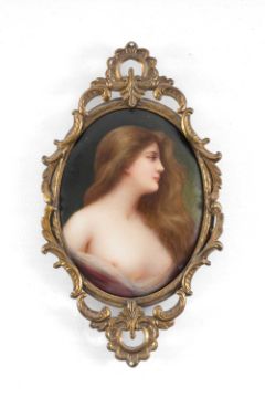 HEUBACH HAND-PAINTED PORCELAIN PLAQUE 'ODALISKE', mounted in a pressed brass frame, 14 x 8cmsProvenance: private collection Cheshire