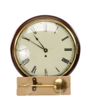 19TH CENTURY MAHOGANY DIAL CLOCK, convex cream painted dial with black Roman numerals, brass bezel and concave glass, fusee movement, 38cms (diam.)Provenance: private collection Cheshire