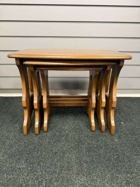 NEST OF ERCOL MEDIUM ELM OCCASIONAL TABLES, largest 42 (h) x 57 (w) x 36cms (d); and an Ercol slat back side chair (2)Provenance: deceased estate Wirral