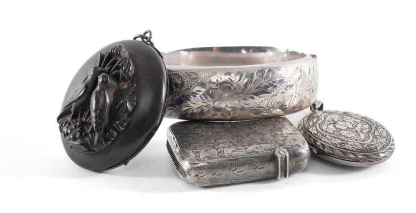 SILVER ENGRAVED HINGED BANGLE, silver vesta case, vine leaf engraved oval silver picture locket, and a Victorian vulcanite oval picture locket, silver weight 2.7ozt (85g)Provenance: deceased estate Wirral