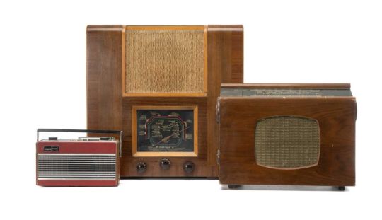 COLLECTION OF VINTAGE WALNUT & OTHER WOODEN CASED RADIOS, including Drummer M45, 49 x 40cms; Belmont; Robert RT22 transistor radio, etc. (8)Provenance: private collection Cheshire