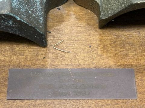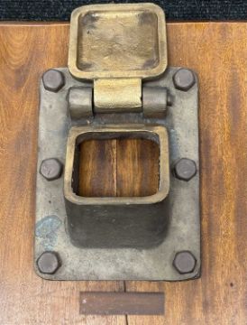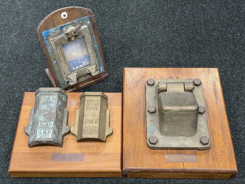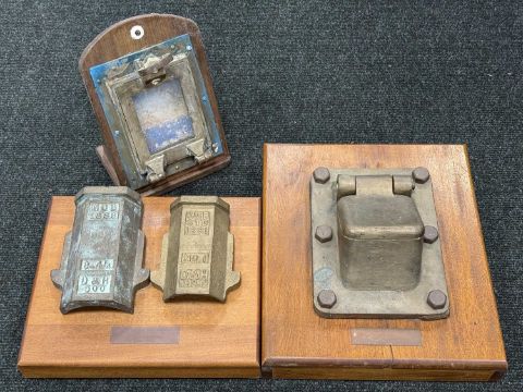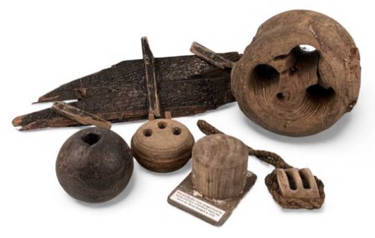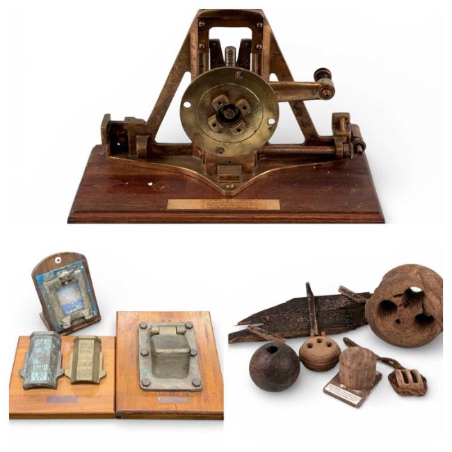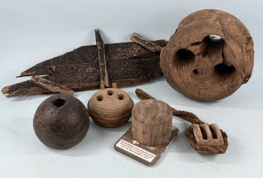 SHIPWRECK SALVAGE & RECOVERED COLLECTABLES including part of a Flinders tube from HMS Conway; two deadeyes; small section of ship's hull, painted black and white; double sheave pulley block and rope, etc., items recovered from the Angloman which ran aground in 1897 a few 100 yards from the lighthouse on the Skerries, North Ynys Môn, including two railway sleeper bearings, freshwater inlet filter, small rectangular brass porthole with retaining clasp, etc., and a vintage brass ship's instrument, possibly a runner position indicator, 26 (h) x 38cms (l), recovered in 2000 from the wreck of the Castilian, mounted on a wooden display standAuctioneer's note: In the early hours of 12 February 1943, the SS Castilian, a 3,000-ton Ellerman Papayanni Company ship carrying munitions from Liverpool to Lisbon, sought shelter from a severe south-westerly gale near Anglesey. After her anchors failed in Church Bay, she attempted to take refuge north of Anglesey but struck the dangerous East Platters Rocks in the channel near the Skerries.A lifeboat from Holyhead launched at 5.25am in darkness and heavy seas and located the ship aground after two hours. Despite the captain’s initial refusal to abandon ship, worsening conditions forced evacuation. All 47 crew members were rescued safely by 8.45am, with only one minor injury.Later that afternoon, the Castilian slipped off the rocks and sank, leaving only her funnels and mast visible. The lifeboat made further hazardous trips to assess the wreck and attempt recovery of confidential mail. Decades later, unexploded ordnance believed to be from the wreck was cleared from nearby Fydlyn Bay in 1987.Provenance: private collection