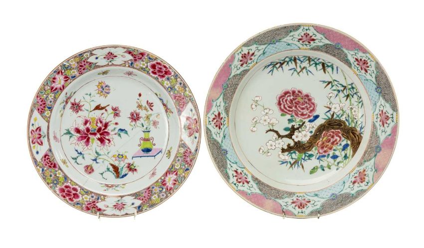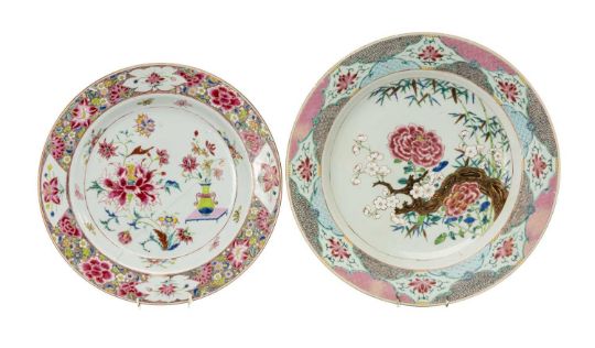 CHINESE QIANLONG FAMILLE ROSE CIRCULAR CHARGER QIANLONG (1736-95), painted with a central flowering hawthorn tree amidst prunus and bamboo, 43.5cms (diam.); and a Chinese export famille rose circular charger, centre painted with vase of flowers and floral sprays, 38cms (diam.)Provenance: private collection Cheshire