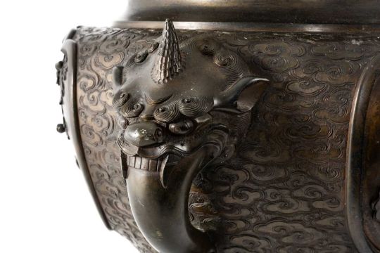 JAPANESE BRONZE JARDINIÈRE, Meiji (1868-1912), cast with cranes and jungle fowl in panels, and with handles formed as mythical beasts, signed, 32 (h) x 43cms (w), 30cms (top diam.)Provenance: private collection Flintshire