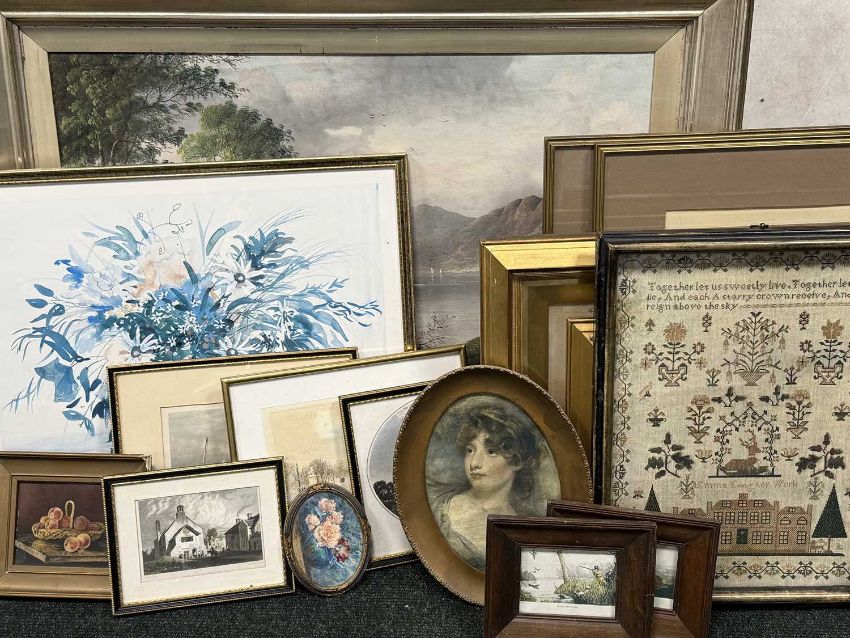ASSORTMENT OF DECORATIVE PICTURES & PRINTS, to include four decorative watercolours, including one by Thomas Mortimer, and a Lake District landscape oil painting, indistinctly signed 'Wallinger', mounted in a silvered frame, 70 x 96cms (qty)Provenance: private collection Cheshire