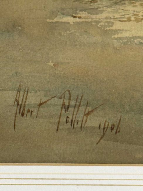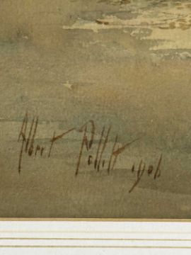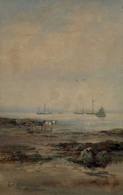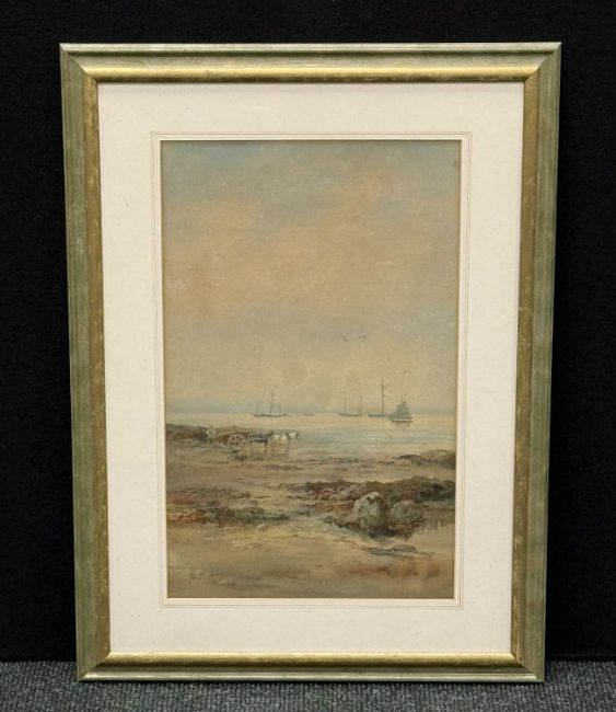 ALBERT POLLITT (British, 1855-1926) watercolour - coastal view with fishing boats, horse, cart and figures in foreground, signed and dated 1901 lower left, 46 x 28cmsProvenance: private collection CheshireComments: framed and glazed