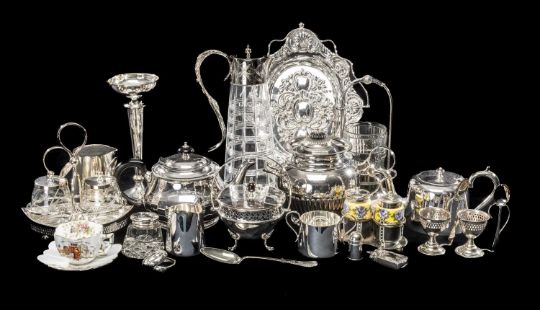 ASSORTED PLATED WARE, including oval swing-handled cake basket, large two-handled sugar basin with hinged lid, cut glass claret jug with plated mounts, condiment stands, hoof form inkwell with hinged cover, etc.Provenance: private collection Flintshire