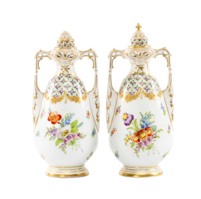 PAIR OF DRESDEN PORCELAIN POTPOURRI VASES, decorated with Deutsche blumen, 25.5cms (h) (2)Provenance: private collection CheshireComments: both covers damaged