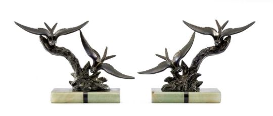 PAIR OF FRENCH ART DECO BRONZED SPELTER ONYX & SLATE MANTEL ORNAMENTS, c. 1930, 21 (h) x 32cms (w)Provenance: private collection Flintshire