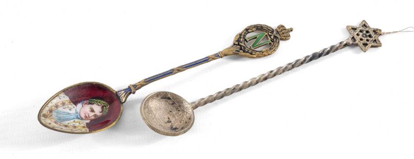 CONTINENTAL 800 STANDARD SILVER & ENAMELLED NAPOLEONIC SOUVENIR SPOON, and a Middle Eastern coin spoon (2)Provenance: private collection Cheshire