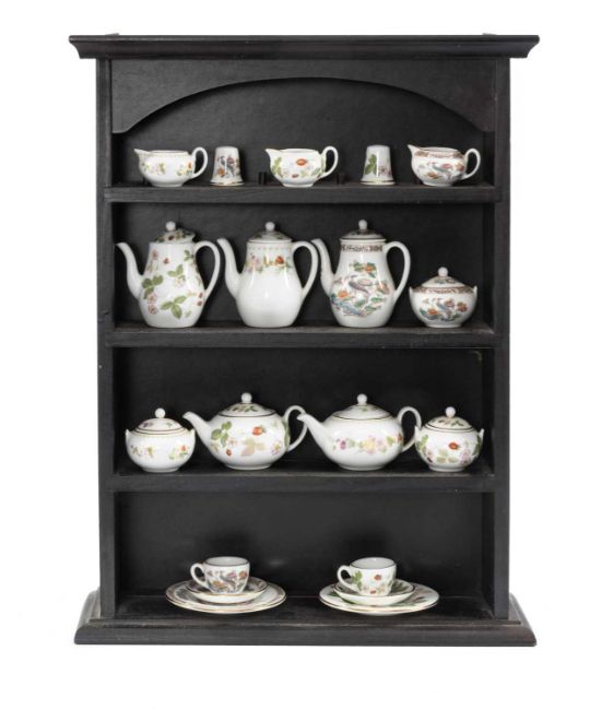 COLLECTION OF WEDGWOOD MINIATURE TEAWARE, including Mirabelle, Wild Strawberry, and Kutani Crane, with wooden wall-mounted display rackProvenance: private collection Cheshire