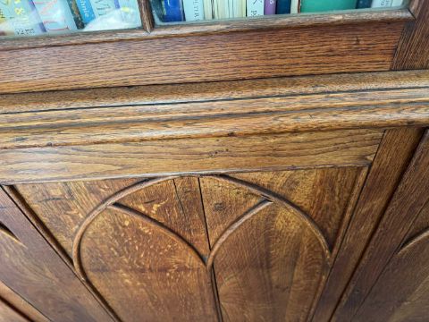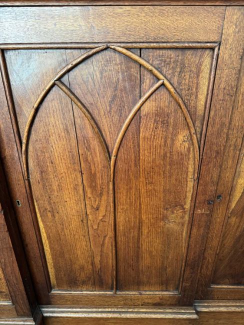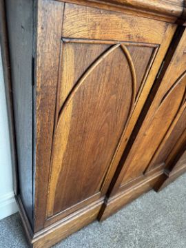 SUBSTANTIAL VICTORIAN OAK LIBRARY BOOKCASE in the Gothic Revival style, upper section having six glazed doors with arched panels, lower having six arched panelled doors, adjustable shelf-lined interior to both sections, on platform base, 295cms (h) x 310cms (w) x 38cms (d)Disclaimer: The main image is not a true image of the back panels, this is for illustration purposes of the bookcase only, please see other images.Viewing purposes and collection: This is in situ in a property in the Caernarfon areaProvenance: private collection Gwynedd
