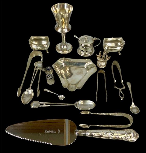 ASSORTED SILVER COLLECTABLES, including ash tray, goblet, pair of open salts, various spoons and sugar tongs, etc., approx. 11ozt grossProvenance: private collection Ynys Môn