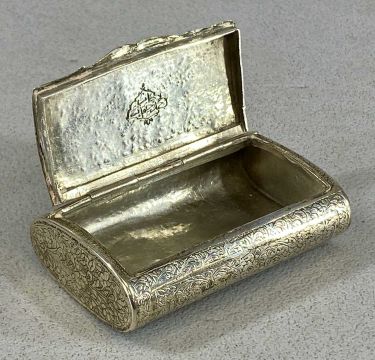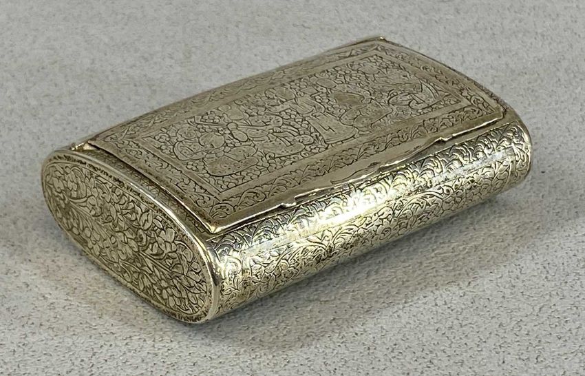 EASTERN WHITE METAL SNUFFBOX, chased decoration with figures, hinged cover, 2.5 x 8 x 5cms, 3oztProvenance: private collection Conwy