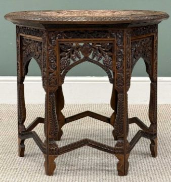 EARLY 20TH CENTURY EASTERN CARVED HARDWOOD FOLDING TABLE, with copper top inserts, 58 (h) x 64cms (diam.)Provenance: private collection Conwy