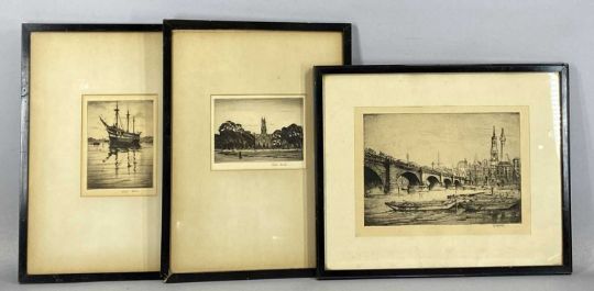 ROBERT HOUSTON black and white etchings - three-masted sailing ship, 15.5 x 11.5cms and church view, 11.5 x 15cms, both signed in pencil; and WILLIAM MONK black and white etching - London Bridge, signed in pencil, 20 x 28cms (3)Provenance: private collection GwyneddComments: framed and glazed