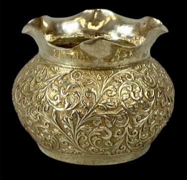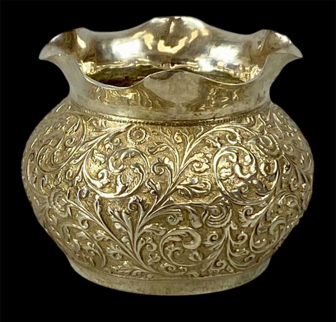 EASTERN WHITE METAL CIRCULAR POT / KALASH, with crimped border, body repoussé decoration of scrolls and leaves, 8 (h) x 9cms (diam.), 113gProvenance: private collection Ynys Môn