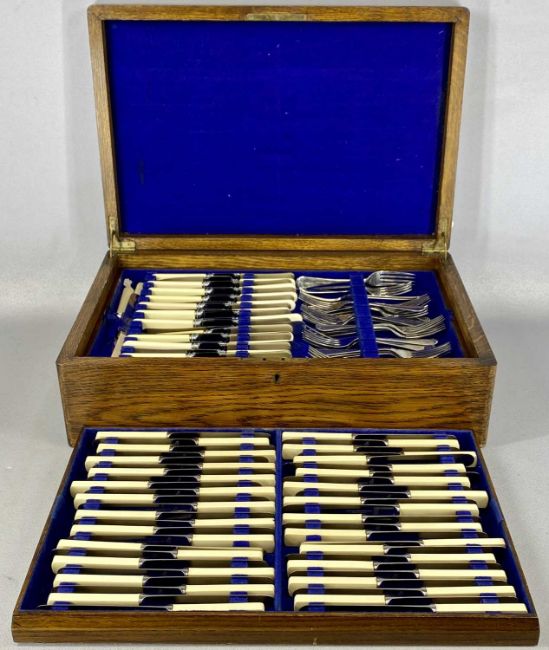 VINTAGE OAK-CASED CANTEEN OF CUTLERY, two lift-out drawers fitted with knives and forks, approx. 98 in total, the undertier holding various other knives and forksProvenance: private collection Gwynedd