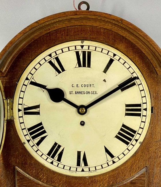 EDWARDIAN OAK-CASED WALL CLOCK with arched top, circular cream enamel dial signed 'C.E. Court, St. Annes-on-Sea', fusee movement, 64 (h) x 44 (w) x 18cms (d)Provenance: private collection Denbighshire