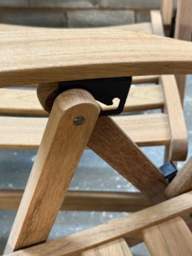 HARDWOOD GARDEN FURNITURE, comprising circular-topped folding table, 75 (h) x 95cms (diam.); set of four folding and reclining chairs, with cushions, 105 (h) x 61 (w) x 46cms (d); and a parasol labelled 'Tramontina' (6)Provenance: deceased estate ConwyComments: appears barely used