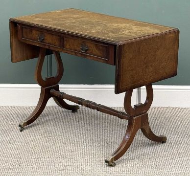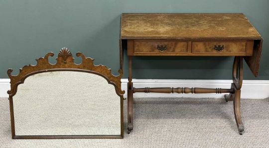 REPRODUCTION WALNUT TWO-DRAWER SOFA TABLE, labelled Shaw of London, 73 (h) x 94/146 (w) x 53cms (d); and a good antique-style walnut shaped-top wall mirror, 86 x 79cms (2)Provenance: deceased estate Conwy