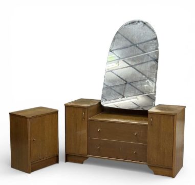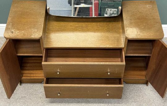 MID-CENTURY TYPE AUSTIN SUITE BEDROOM FURNITURE, comprising dressing table, 144 (h) x 115 (w) x 43cms (d); and a bedside cabinet, 56 (h) x 41 (w) x 29cms (d) (2)Provenance: deceased estate Conwy