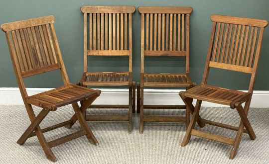 MODERN HARDWOOD GARDEN FURNITURE, comprising a hexagonal shaped folding table, 70 (h) x 110 (w) x 110cms (d); and a set of four matching folding chairs, 92 (h) x 46 (w) x 37cms (d) (5)Provenance: deceased estate GwyneddComments: appears barely used
