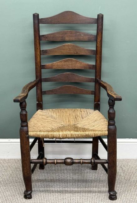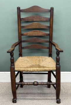 ANTIQUE OAK RUSH-SEATED LADDER-BACK CHAIR, on hoof supports, 110 (h) x 63 (w) x 42cms (d)Provenance: private collection Conwy