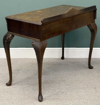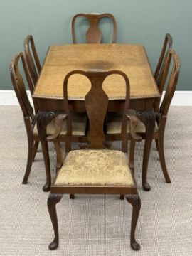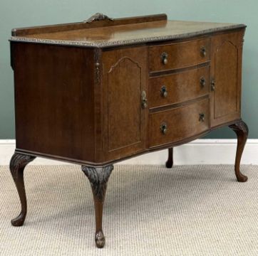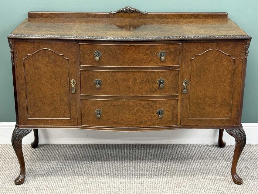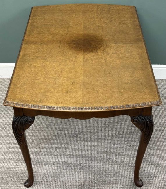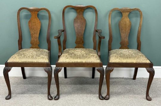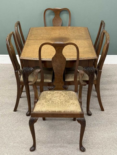 BURR WALNUT QUEEN ANNE STYLE DINING FURNITURE, comprising extending dining table, 77 (h) x 130/168 (w) x 84cms (d); a set of six chairs (4+2); a bow-fronted sideboard, 98 (h) x 133 (w) x 57cms (d); and a two-drawer console table/server, 91 (h) x 105 (w) x 54cms (d) (9)Provenance: deceased estate Conwy