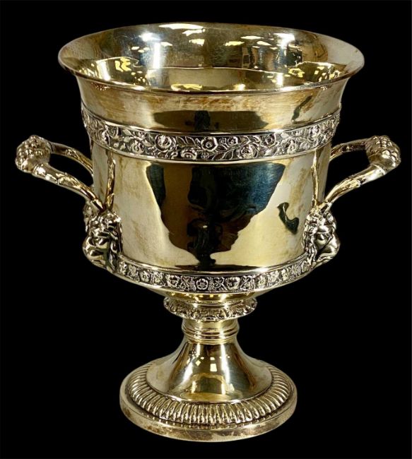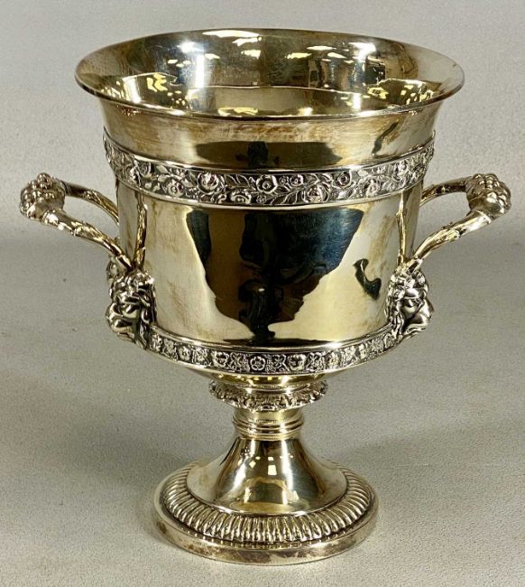 GEORGE III SILVER TWIN-HANDLED WINE COOLER, with bands of flowers, grape cast handles with lion mask terminals, gadrooned circular foot, Rebbeca Emes & Edward Barnard I, London 1819, 21.5cms (h), 31oztProvenance: private collection Ynys Môn