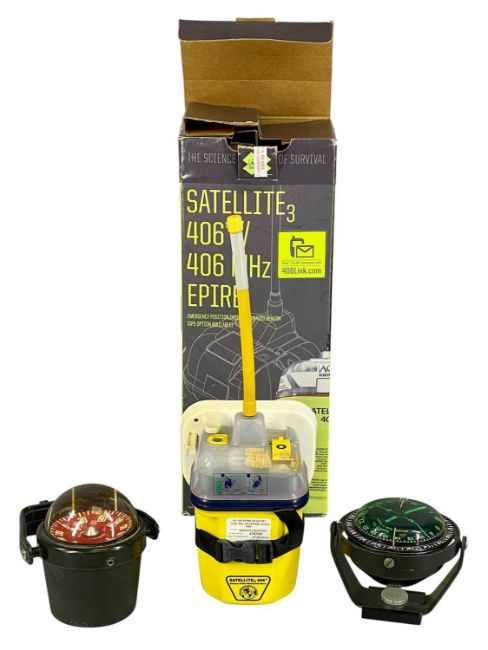 NAVIGATIONAL EQUIPMENT, an ACR Electronics emergency position indicating radio beacon, and two nautical compasses mounted on gimblesProvenance: private collection Conwy
