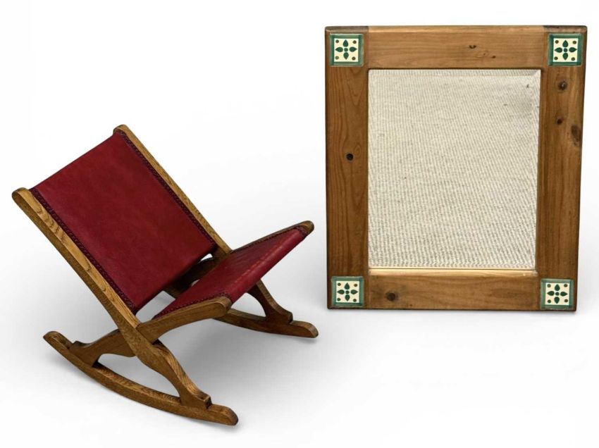 OAK-FRAMED & UPHOLSTERED GOUT ROCKING STOOL, 40 (h) x 38 (w) x 54cms (d); and a small pine vintage wall mirror, 70 x 59cms (2)Provenance: private collection Denbighshire