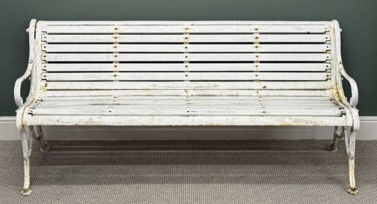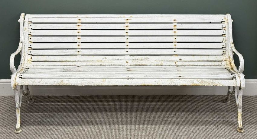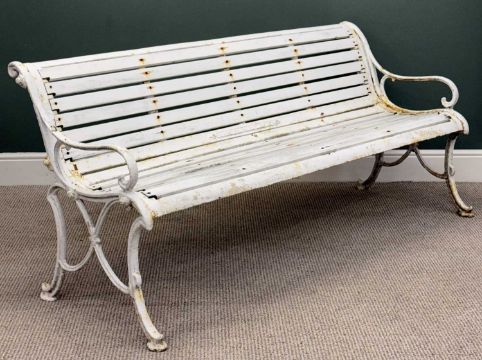 GARDEN BENCH with scrolled cast metal ends, white painted wooden slats, labelled 'Robert Hall & Sons, Bury Ltd.', 80 (h) x 183 (w) x 70cms (d)Provenance: deceased estate Conwy