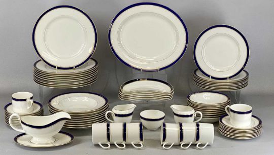ROYAL WORCESTER HOWARD PATTERN DINNER & TEAWARE, white with cobalt blue and gilt-banded border, including five crescent-shaped dishes, oval plate, sauceboat and stand, approx. 68 piecesProvenance: private collection Gwynedd