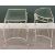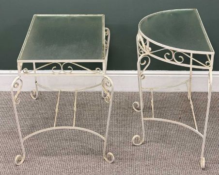 TWO METAL & GLASS HALL TABLES, a half-moon table, 67 (h) x 90 (w) x 39cms (d); and an oblong table, 62 (h) x 86 (w) x 55cms (d) (2)Provenance: deceased estate Conwy