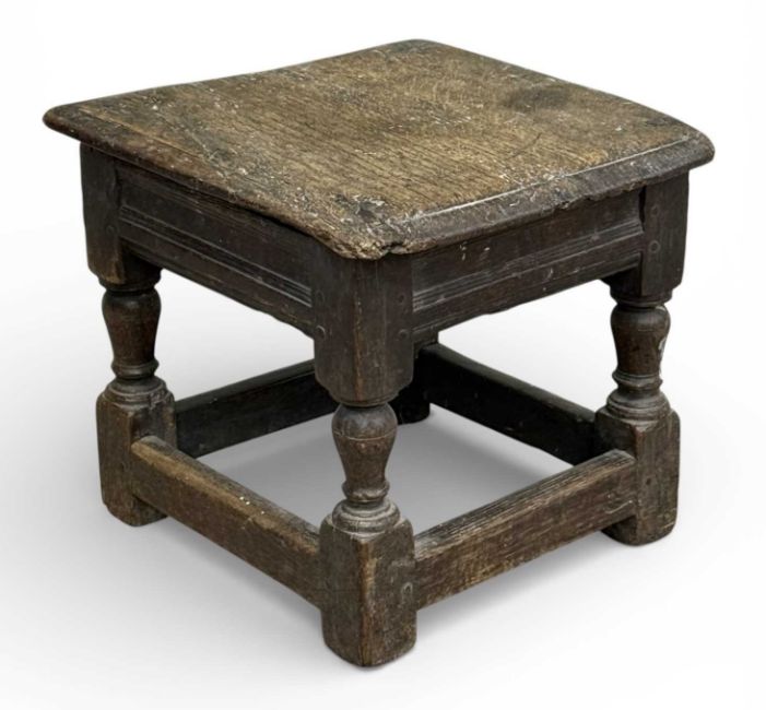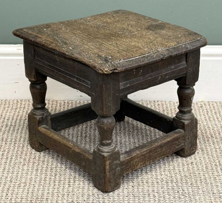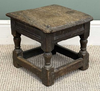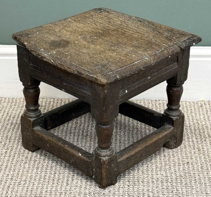 EARLY 19TH CENTURY OAK MILKING TYPE STOOL, on turned and block supports and stretchers, 29 (h) x 34 (w) x 33cms (d)Provenance: private collection Conwy