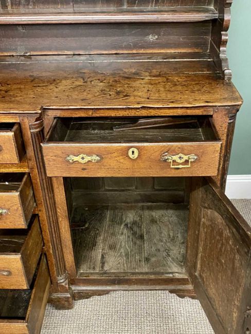 18TH CENTURY OAK NORTH WALES WELSH DRESSER with breakfront, three-shelf rack, T arrangement of drawers, and two cupboard doors with fielded panels, 197 (h) x 167 (w) x 56cms (d)Provenance: private collection Conwy