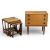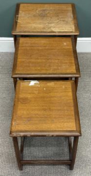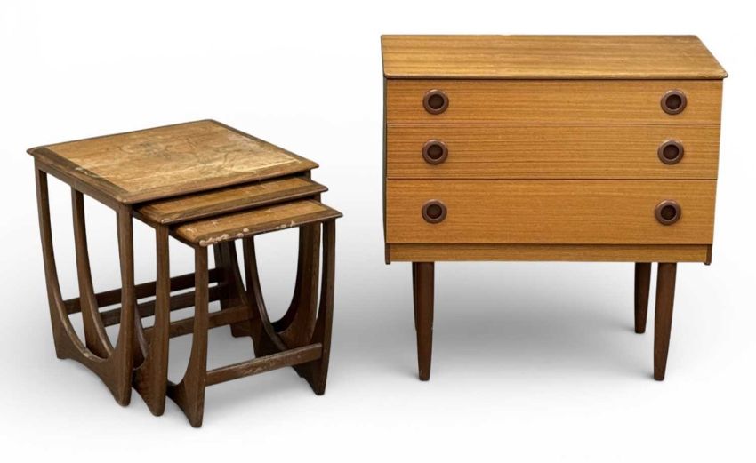 G PLAN MID-CENTURY TEAK-TYPE NEST OF THREE COFFEE TABLES, largest 51 (h) x 50cms²; and a similar era bedroom chest of three drawers, 74 (h) x 75 (w) x 40cms (d) (4)Provenance: deceased estate Gwynedd
