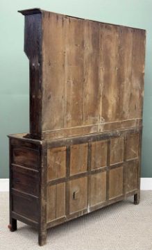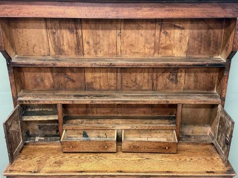 18th CENTURY OAK WELSH DRESSER, three shelf rack with two small cupboard doors and drawers, the base with three drawers over three fielded panelled doors, 196 (h) x 151 (w) x 49cms (d)Provenance: private collection Ynys Môn