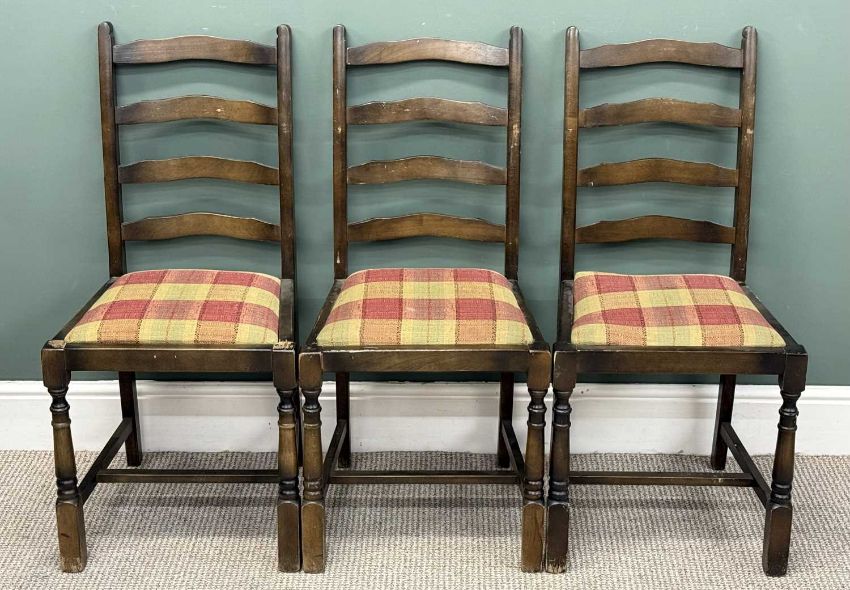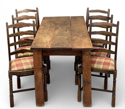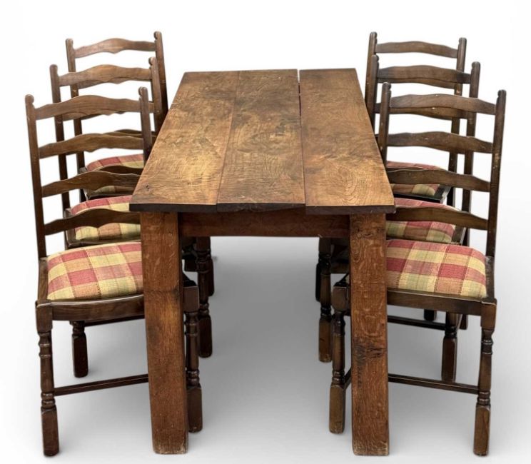 20TH CENTURY THREE-PLANK OAK REFECTORY STYLE TABLE, 77 (h) x 167 (w) x 68cms (d); and a set of six ladder-back chairs with upholstered seats (7)Provenance: private collection Ynys Môn