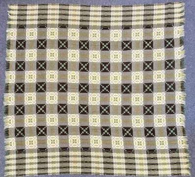 TRADITIONAL WELSH WOOLLEN BLANKET, green, black, cream and yellow geometric pattern, double sided and fridged, 230 x 220cmsProvenance: private collection Denbighshire