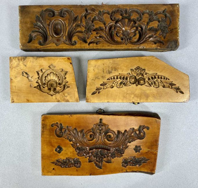 FOUR INTERESTING 19TH CENTURY POLISHED BOXWOOD GESSO MOULDS, 26 x 14cms the largestProvenance: private collection Conwy