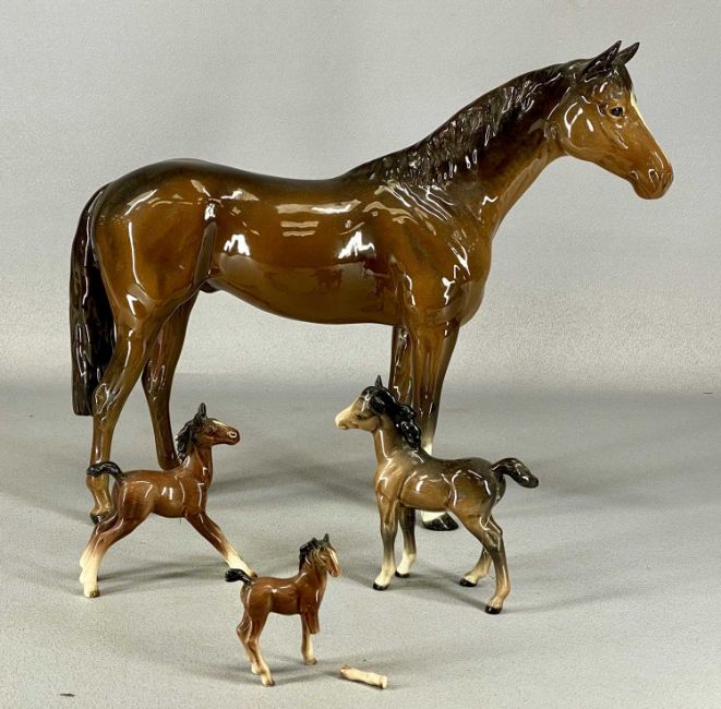 BESWICK HORSES, large bay hunter and three foalsProvenance: deceased estate Conwy