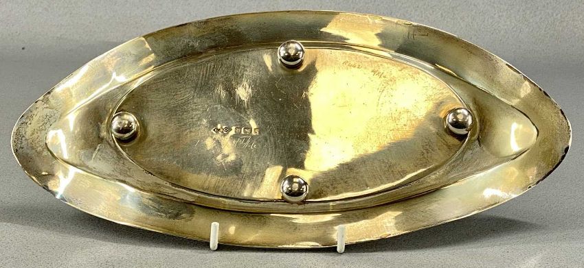LIBERTY & CO. EDWARDIAN OVAL SILVER DISH, with a border of grape and vine leaf, on four bun feet, Birmingham 1906, 28.5 x 12.5cms, 7.5oztProvenance: private collection Gwynedd